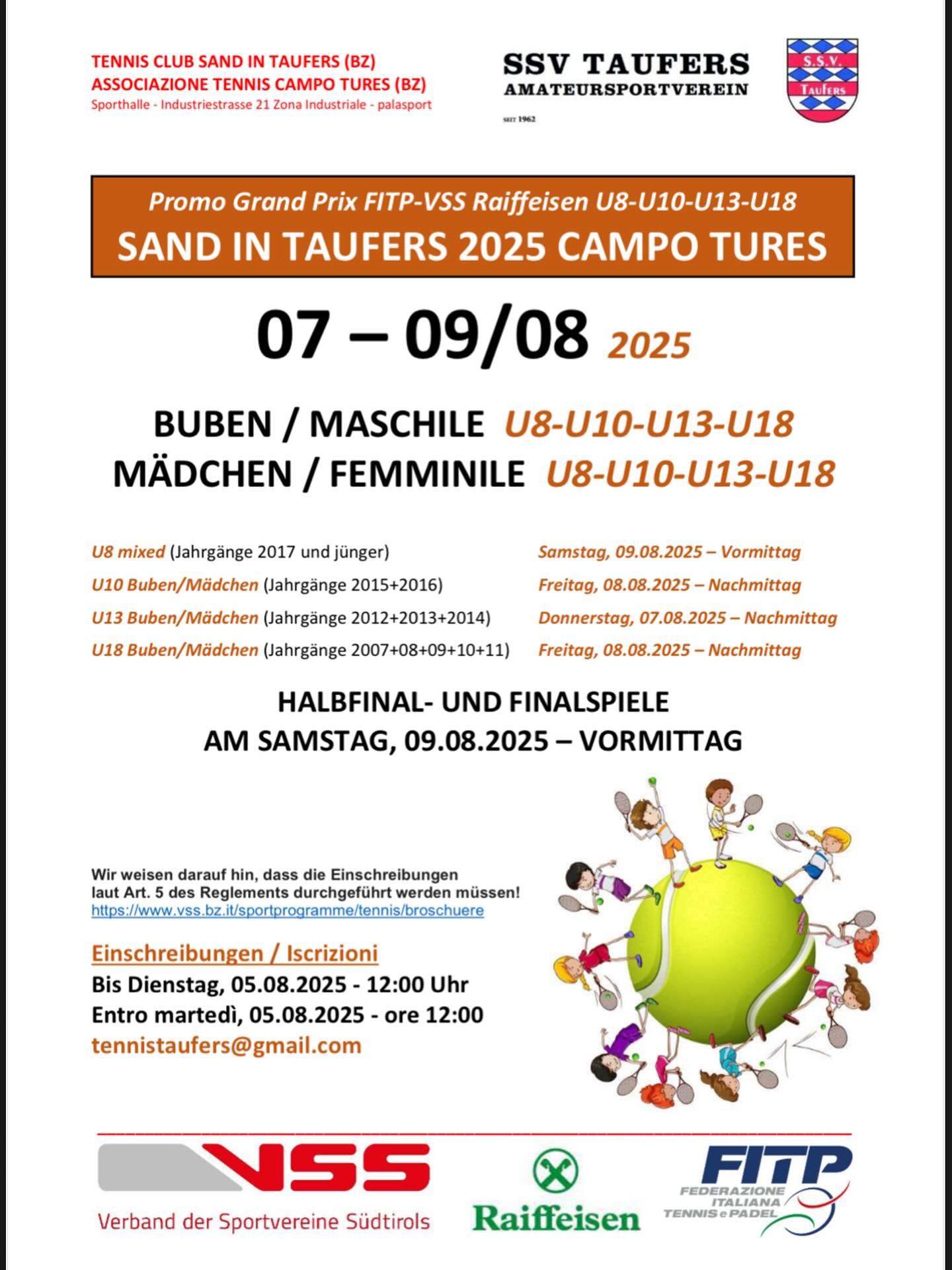 Tennisplatz Sand in Taufers Industriestrasse 21, Sand in TaufersVom 07. bis 09. August startet das Jugendturnier U8-U19-U13-U18 in Sand in Taufers. Anmeldeschluss ist der 05.08.2025 12 Uhr.